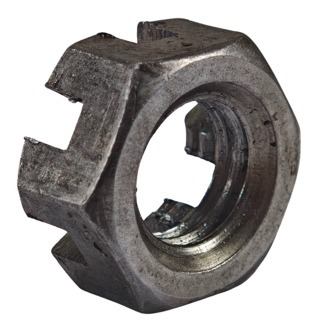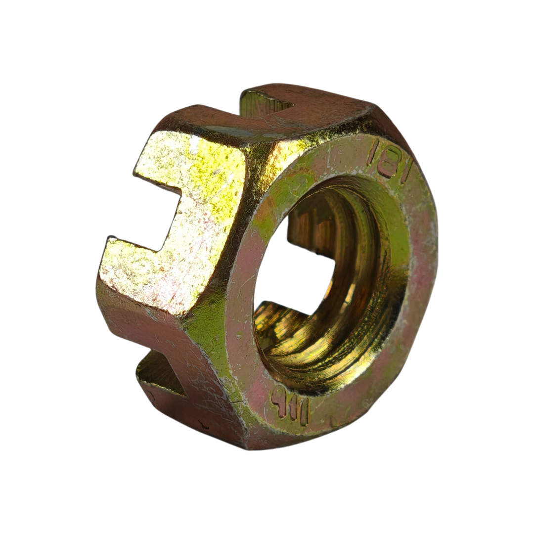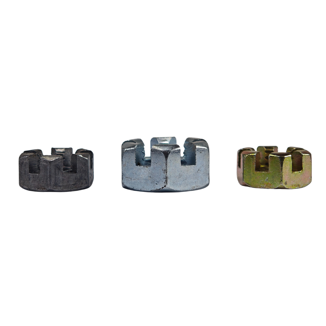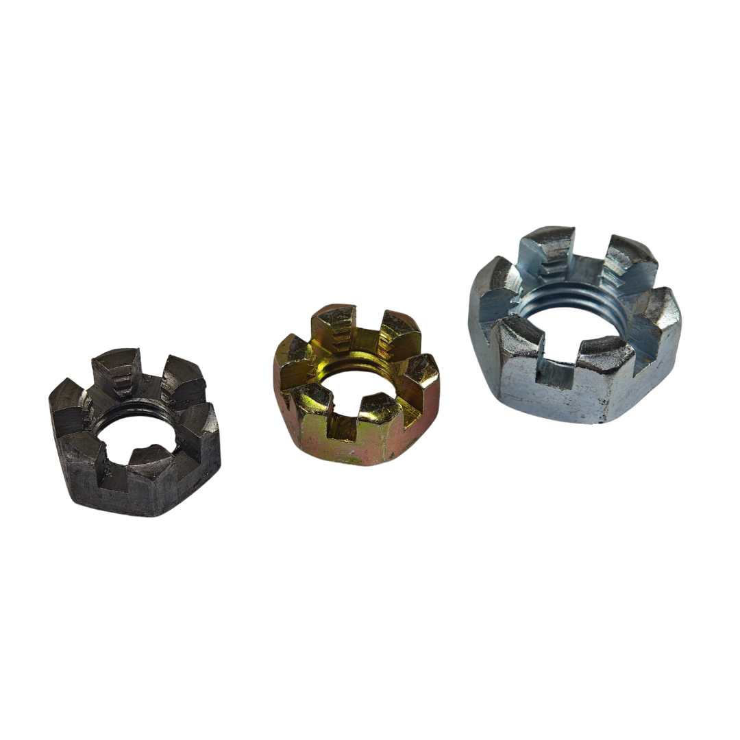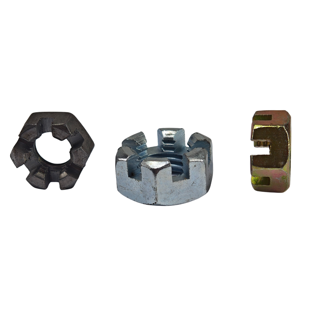 Aplicações e onde é usada: A Porca Castelo é amplamente utilizada em sistemas automotivos, aeronáuticos, ferroviários, agrícolas, industriais e em estruturas metálicas, sendo essencial em eixos, mancais, sistemas de direção, suspensões e montagens sujeitas a vibrações intensas.