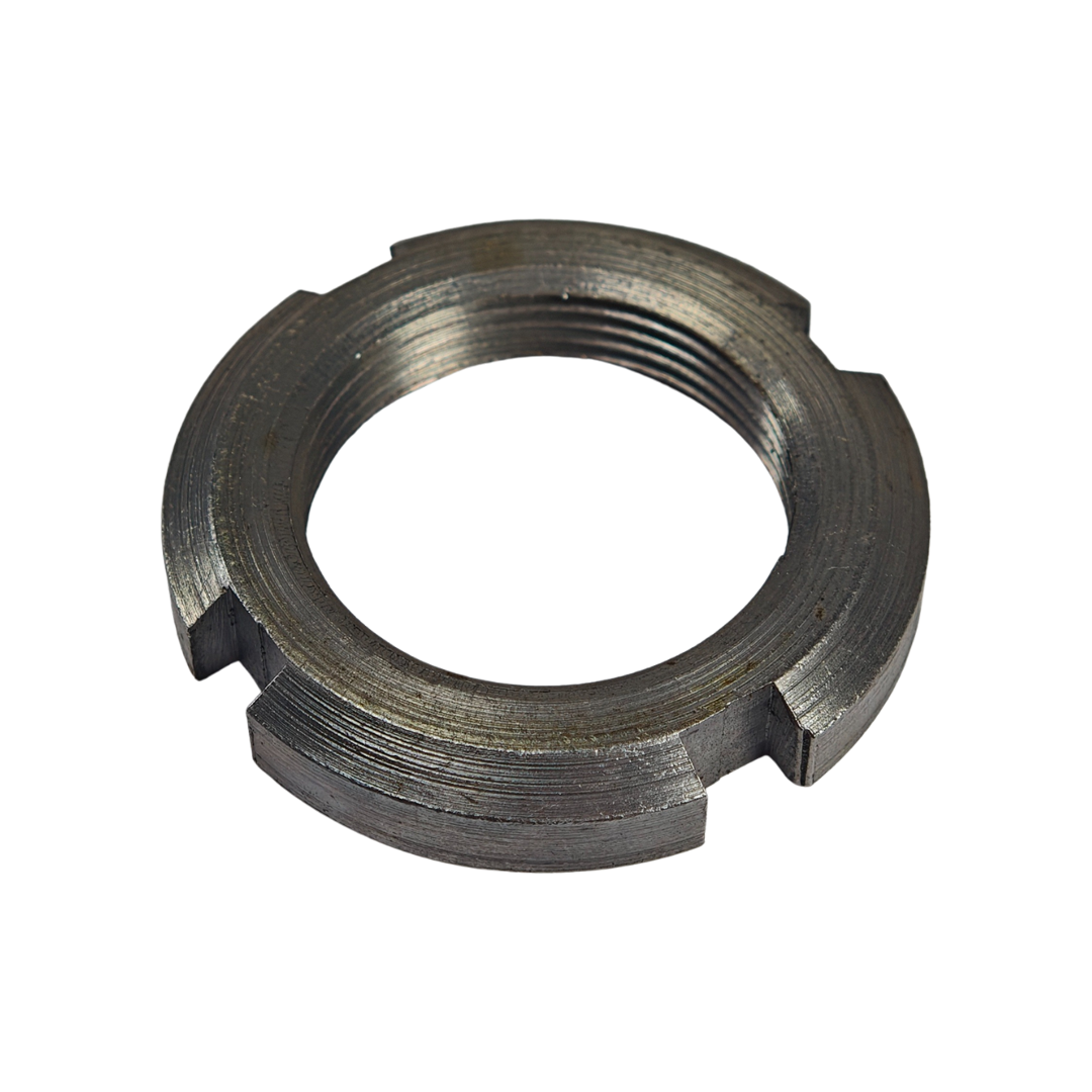 O que é e principais funções: Também conhecida como Slotted Nut, essa porca é utilizada em montagens de precisão e sistemas rotativos, servindo para ajuste axial e fixação de componentes em eixos, rolamentos e buchas. As ranhuras permitem travamento com pino ou arruela especial, impedindo o giro acidental durante o funcionamento do equipamento.