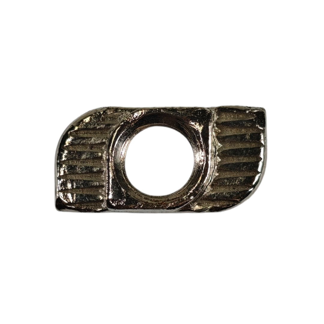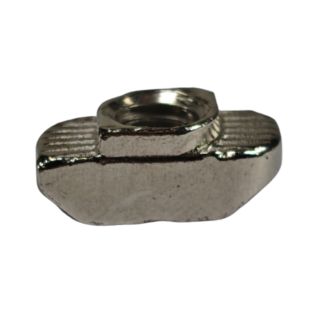 O que é e principais funções: Também conhecida como T-Nut, essa porca é usada para fixar acessórios, suportes e componentes em trilhos de máquinas, mesas de usinagem e perfis extrudados, permitindo ajustes rápidos de posição sem desmontar o conjunto. Seu formato evita o giro durante o aperto, garantindo travamento seguro e preciso.